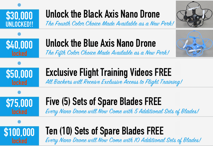 STRETCH GOALS ARE HERE!!! Only $550 Left to Unlock The Black Nano Drone!! In order to maintain production and shipping timelines we are creating separate perks for each color, this allows us to know the exact quantity to...